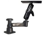 Kit Anclaje soporte rectangular giratorio horizontal con brazo estandar. El soporte se atornilla sobre una superficie horizontal. Las palomillas permiten regular la posición de ambos soportes 360º. Sobre la base rectangular taladrada se pueden fijar mediante tornillos soportes de GPS fijos, sondas, radares, soportes de emisora etc.